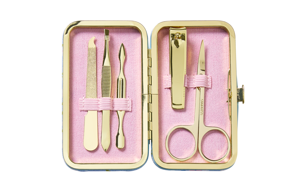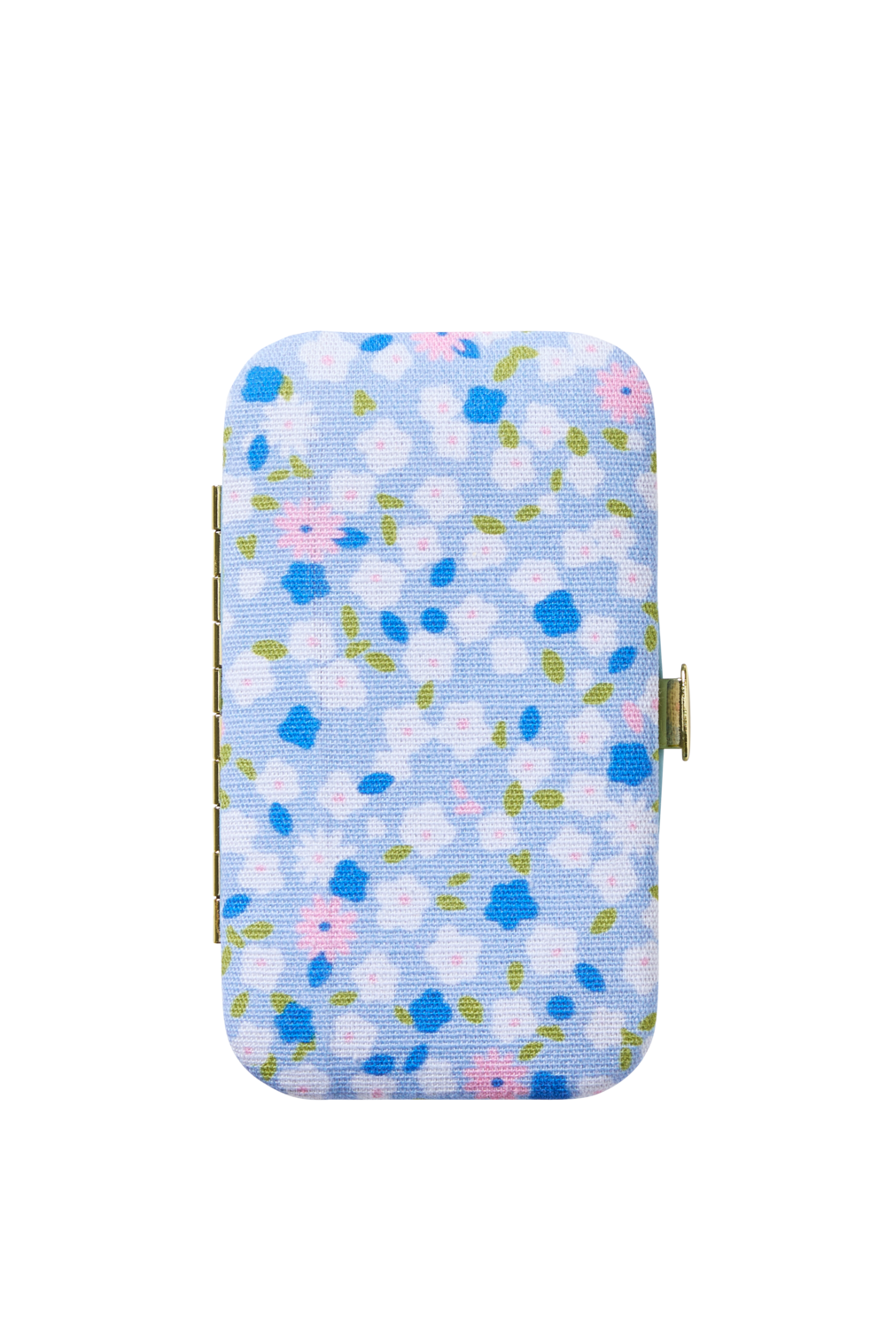 Tackle anything life throws at you with perfectly manicured nails thanks to this manicure set from the WHSmith Dizzy Bloom range featuring blue and white floral illustrations on a blue fabric case. The case houses a 5 piece set including: a nail file, pair of nail scissors, nail clippers, cuticle pusher, and tweezers.