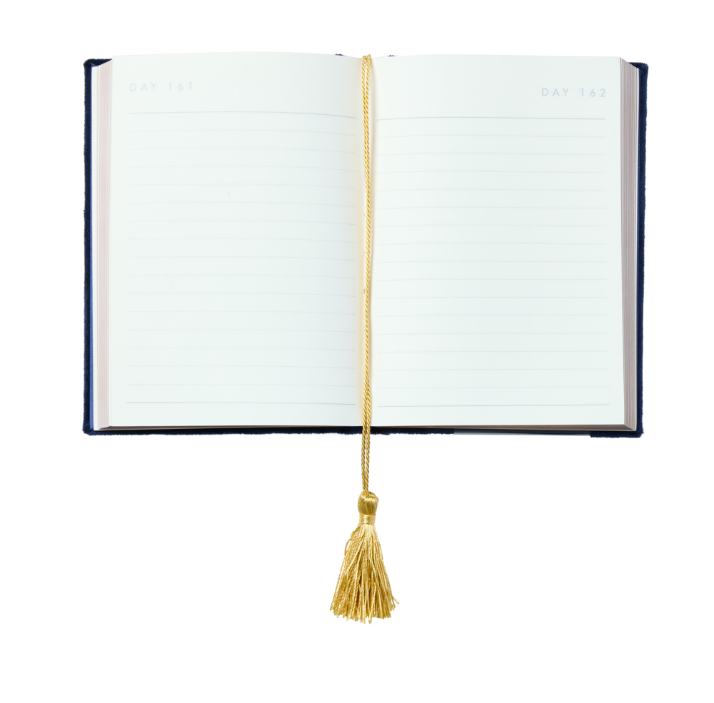 An A6 365 day journal from the WHSmith Folkstory range with a midnight blue hardcover featuring gold foil stars. This journal features white lined pages, numbered day of the year pages, a gold tassel marker, and is perfect for when you're at home, the office, or on the go.