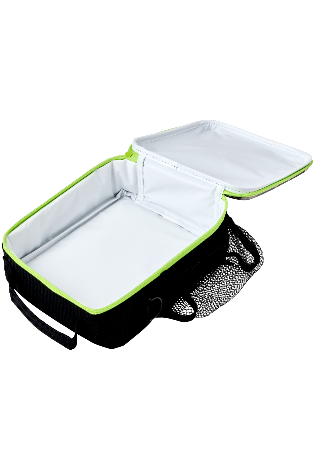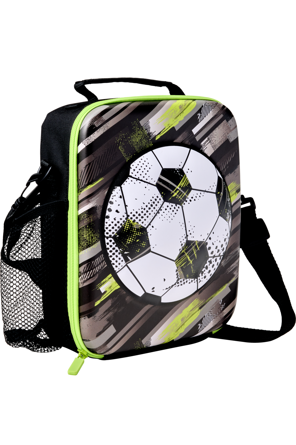 Carry your lunch with you wherever you need to go with this awesome lunch bag from the WHSmith Football range, featuring a white football with grey and green markings on a black case. It features a large insulated compartment to keep food cool, an elastic netting to store a drink bottle, a handle, and a strap to carry it around.