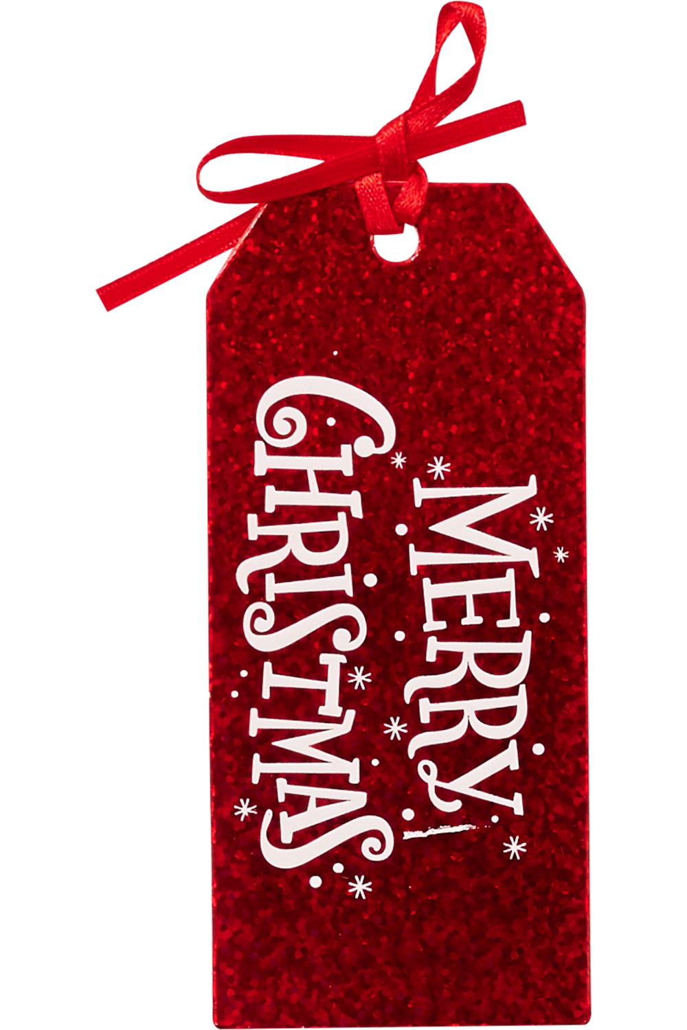 Add a festive finish to your Christmas gifts and personalise them with these rectangular holographic red gift tags which feature the phrase 'Merry Christmas' in white script. Pack of six tags each with a red ribbon attached.
