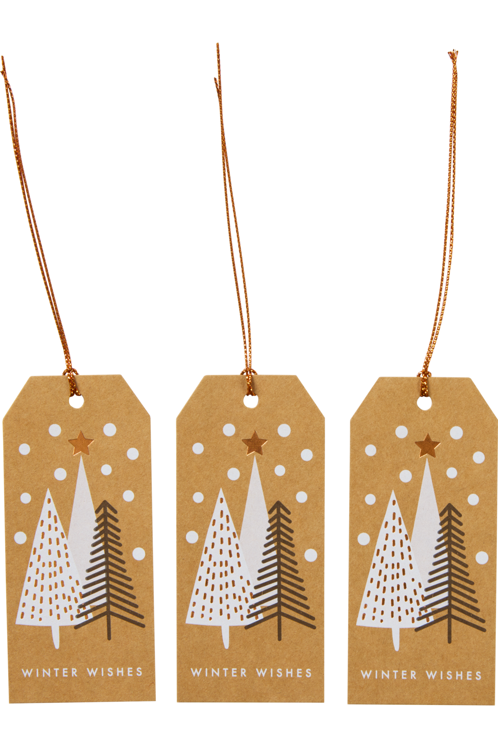 Top off your gifts this festive season with this pack of 4 gift tags from WHSmith featuring white and black trees on a kraft background and the words "Winter Wishes". The tags feature a gold foil star and a gold string.