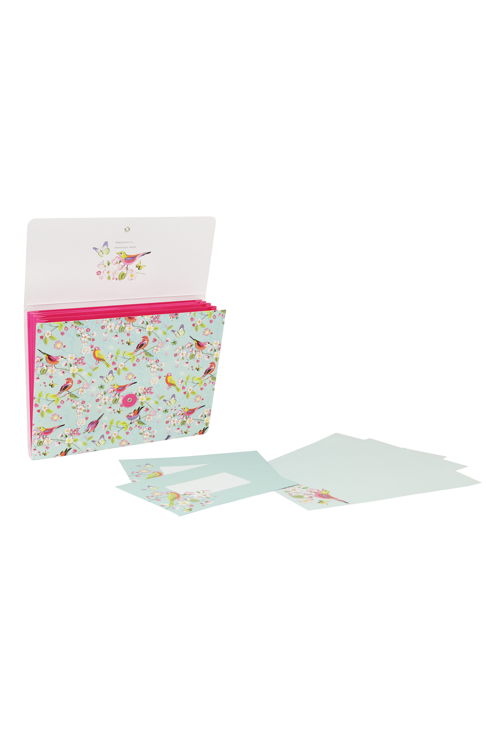 A WHSmith writing set from the melodie collection. Contains 30 sheets of letter paper, 15 envelopes and a sheet of stickers for sealing, all featuring a songbird and chevron pattern design. The entire set is contained within a softcover expanding folder featuring four pockets and a string closure.