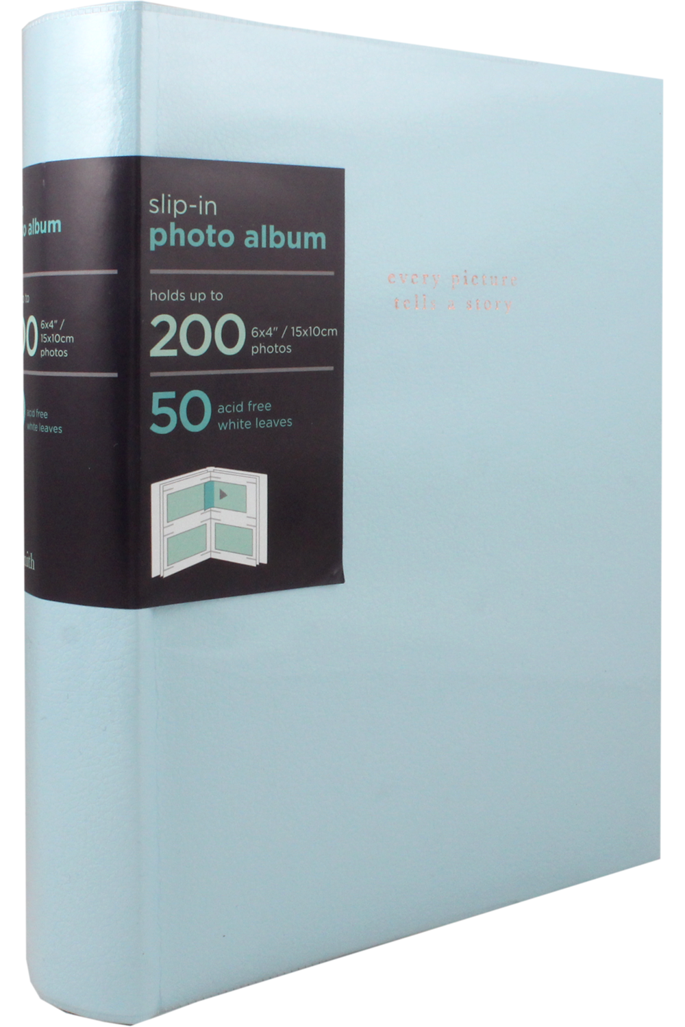 A WHSmith photo album, featuring 50 white acid-free leaves with 200 slip-in pockets for 6x4" sized photos.