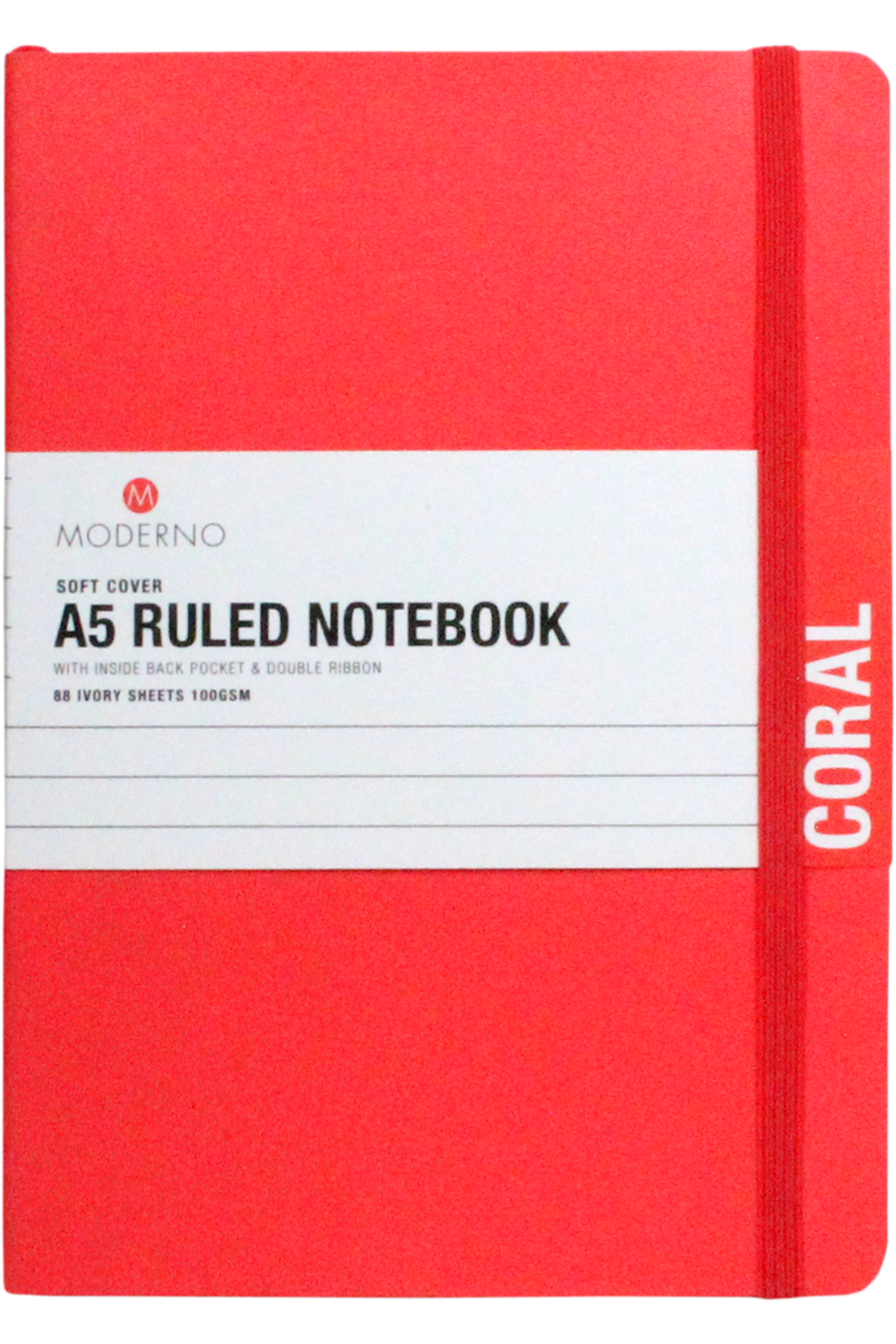 Write down all your important notes and thoughts with this A5 softcover notebook from the WHSmith Moderno range featuring a coral coloured cover. This notebook features 88 ivory ruled pages, a coral elastic closure, two ribbon markers, an inside back pocket, and is perfect for when you're at home, the office, or on the go.