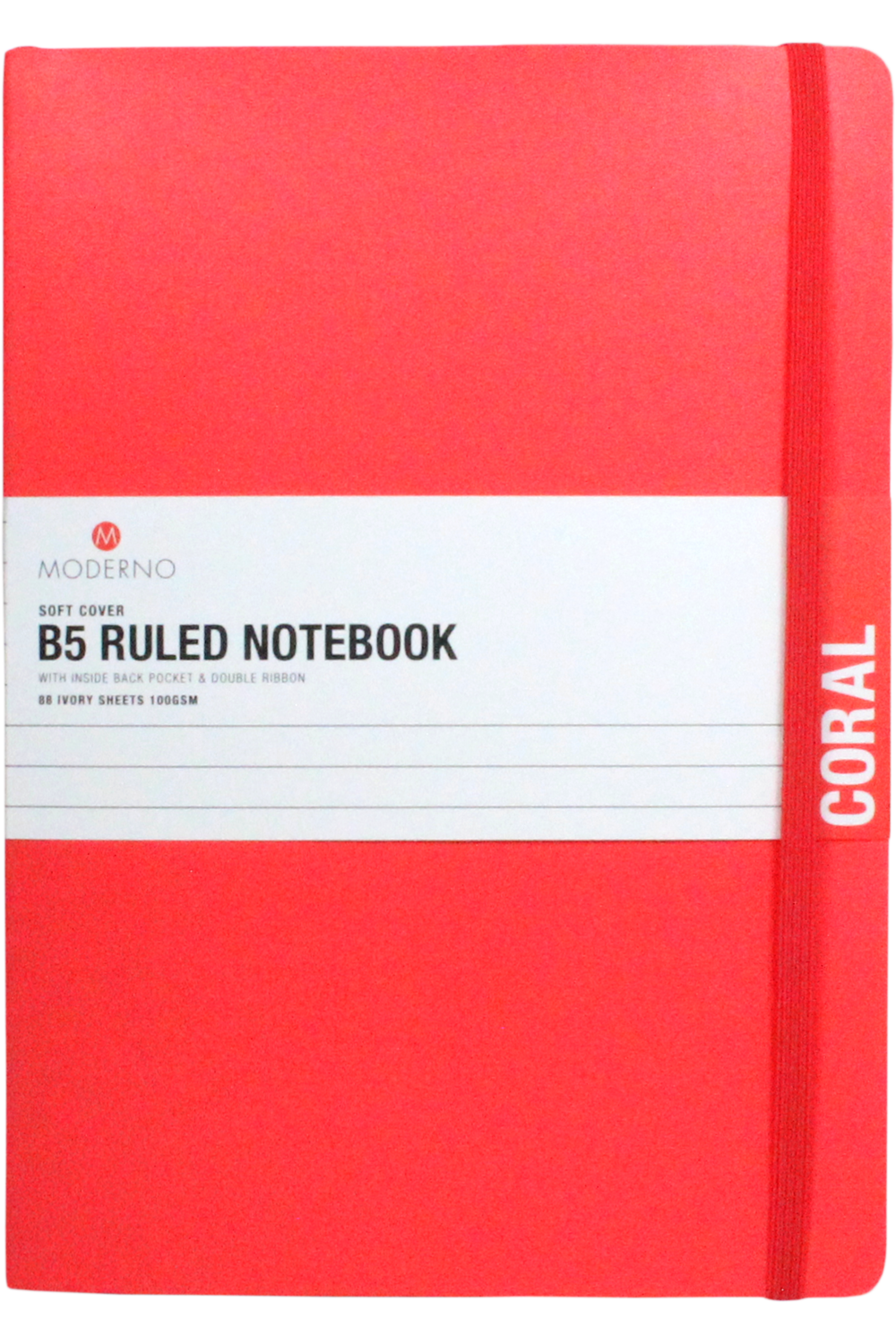 Write down all your important notes and thoughts with this B5 softcover notebook from the WHSmith Moderno range featuring a coral coloured cover. This notebook features 88 ivory ruled pages, a coral elastic closure, two ribbon markers, an inside back pocket, and is perfect for when you're at home, the office, or on the go.