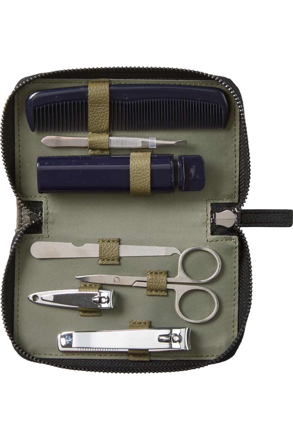 - Contains: Comb, toothbrush, tweezers, nail scissors, nail file and two pairs of nail clippers