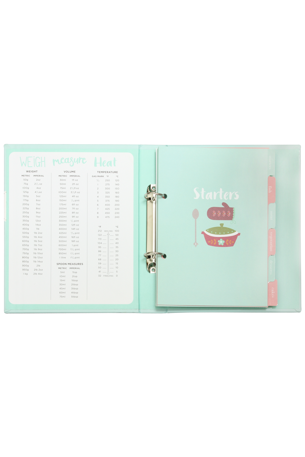 This WHSmith recipe folder includes everything necessary to keep your kitchen organised and your recipes tidy. Features a 2-ring binder, tabbed pages for starters, fish, meat, vegetarian, desserts and cakes, a measurement conversion chart, and clear pockets for recipe cards.