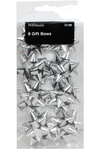 Add the finishing touch to your gifts with this pack of eight silver gift bows. Each bow features a peelable backing to make attaching them to presents simple and easy.