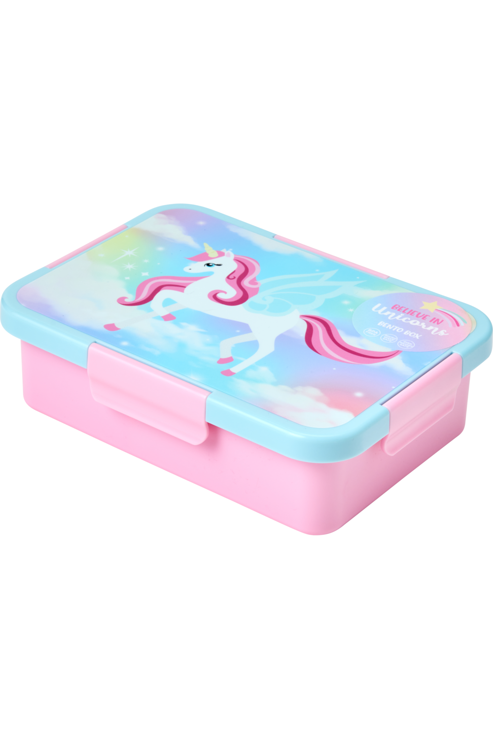 Keep your lunch nice and fresh wherever you go with this magical bento lunch box from the WHSmith Unicorn range, featuring a unicorn flying through a rainbow sky on a light blue lid. The lunch box features two small and one medium sized compartments, and the lid features a silicon rim around the compartments to create a tight seal.