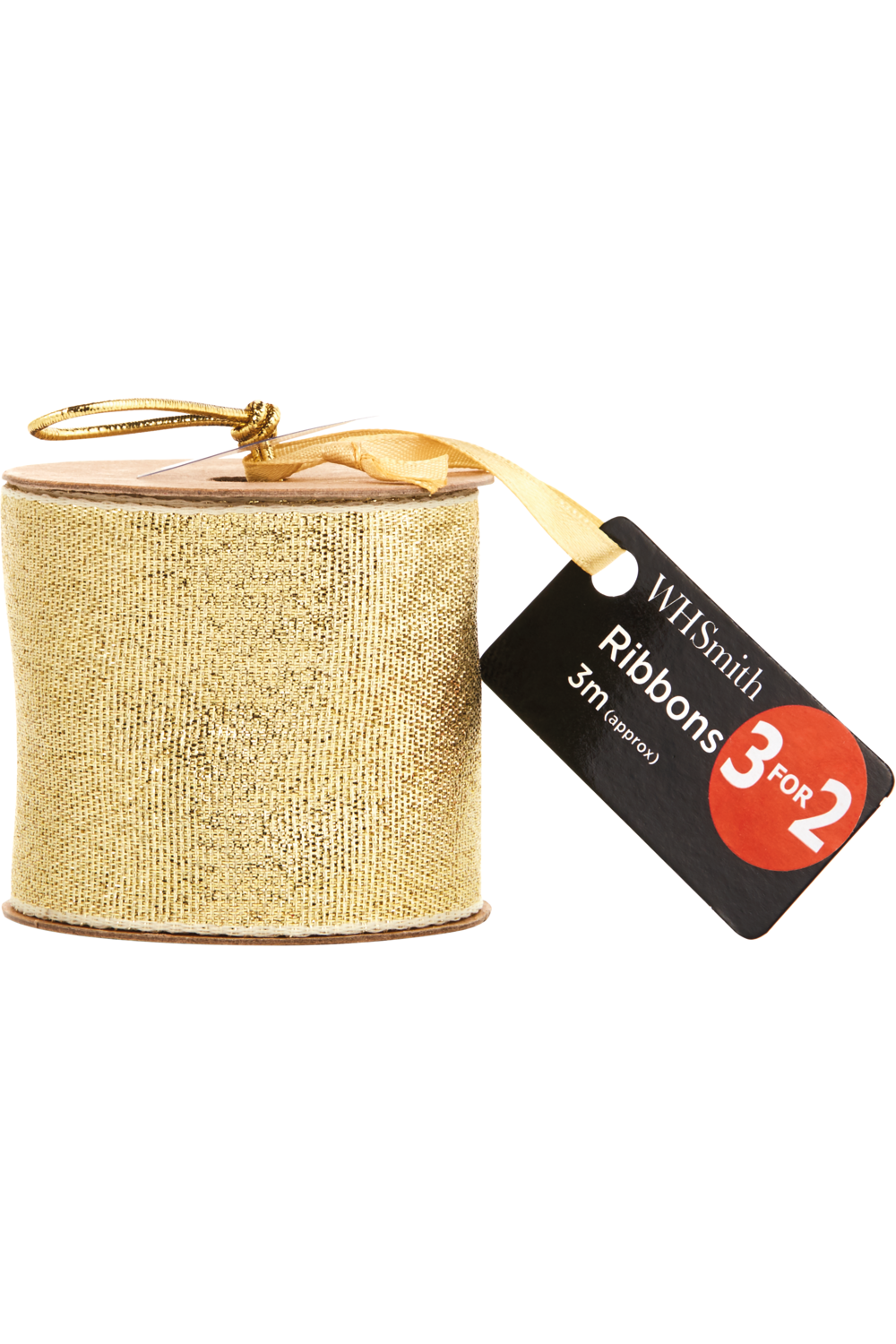 A pack of metallic gold wide fabric ribbon from WHSmith.