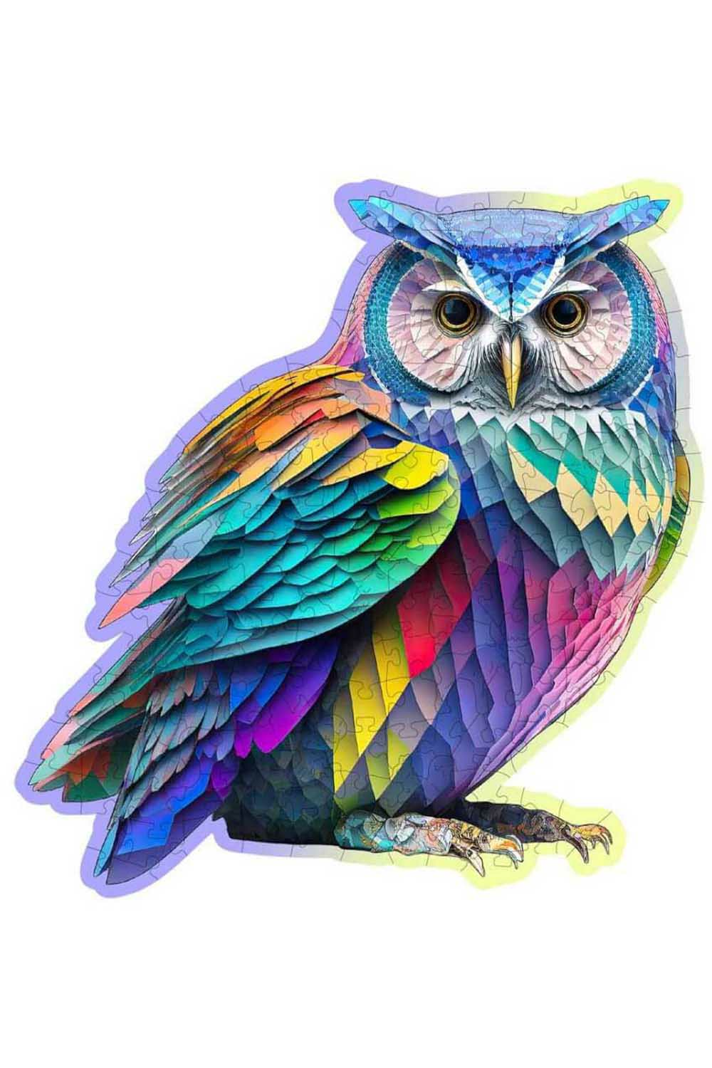 Welcome to the alluring realm of the Trendy Owl 150 Wooden Puzzle, meticulously crafted in Poland, the heart of Europe. Adorning this extraordinary assemblage is a stunning, rainbow-hued owl, a symbol of wisdom and natural beauty. Designed in the silhouette of an owl's head, this wooden puzzle offers an immersive and stimulating challenge, ideal for both adults and children aged 10 and above. Its radiant colours serve as an invitation into a world teeming with creativity and enjoyment. This assembly challenge stands out due to its assortment of specialized, thematic pieces, influenced by various elements from the animal kingdom to iconic landmarks. These elements enrich the experience by adding a layer of complexity and allure to the assembly process.