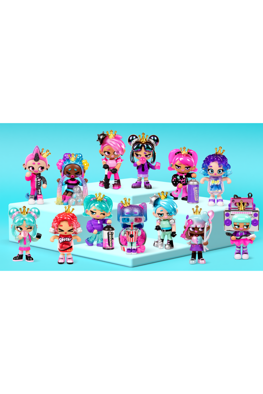 Discover the fabulous XOX Kweenie Mystery Doll Figurine - Fearless Theme! This series features 13 unique Kweens, each with their own bold personality, from the Kween of Drama with glitter-filled tears to the Kween of Game Day ready to dominate the competition. There's even a limited edition Kween of Spooky Night, with only 1,000 available! Standing 10 cm tall, each Kweenie boasts premium finishes, including glitter, metallic, glow-in-the-dark, and liquid fills. Collect across 2 series - Quirky and Fearless - with surprises at every turn, including a secret figure. Each figurine comes with a stackable display case with a front door, perfect for showing off your collection. Packaged blind, the mystery of which Kween you'll find adds extra excitement. Collect them all to embrace the fearless spirit of these stunning figures!